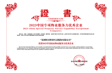 服务理念:星服务 心托付星河智善生活集团,成立于1999年。是一家集住宅服务、商企服务、智慧楼宇、增值服务四大业务板块为核心的平台化、多元化、数字化的现代服务企业,为超过40万客户业主提供高端精品服务。服务业态涵盖住宅、公寓、写字楼、产业园区、商业、政府公建、酒店、学校等12类业态,系国内物业管理类型最丰富的企业之一。
